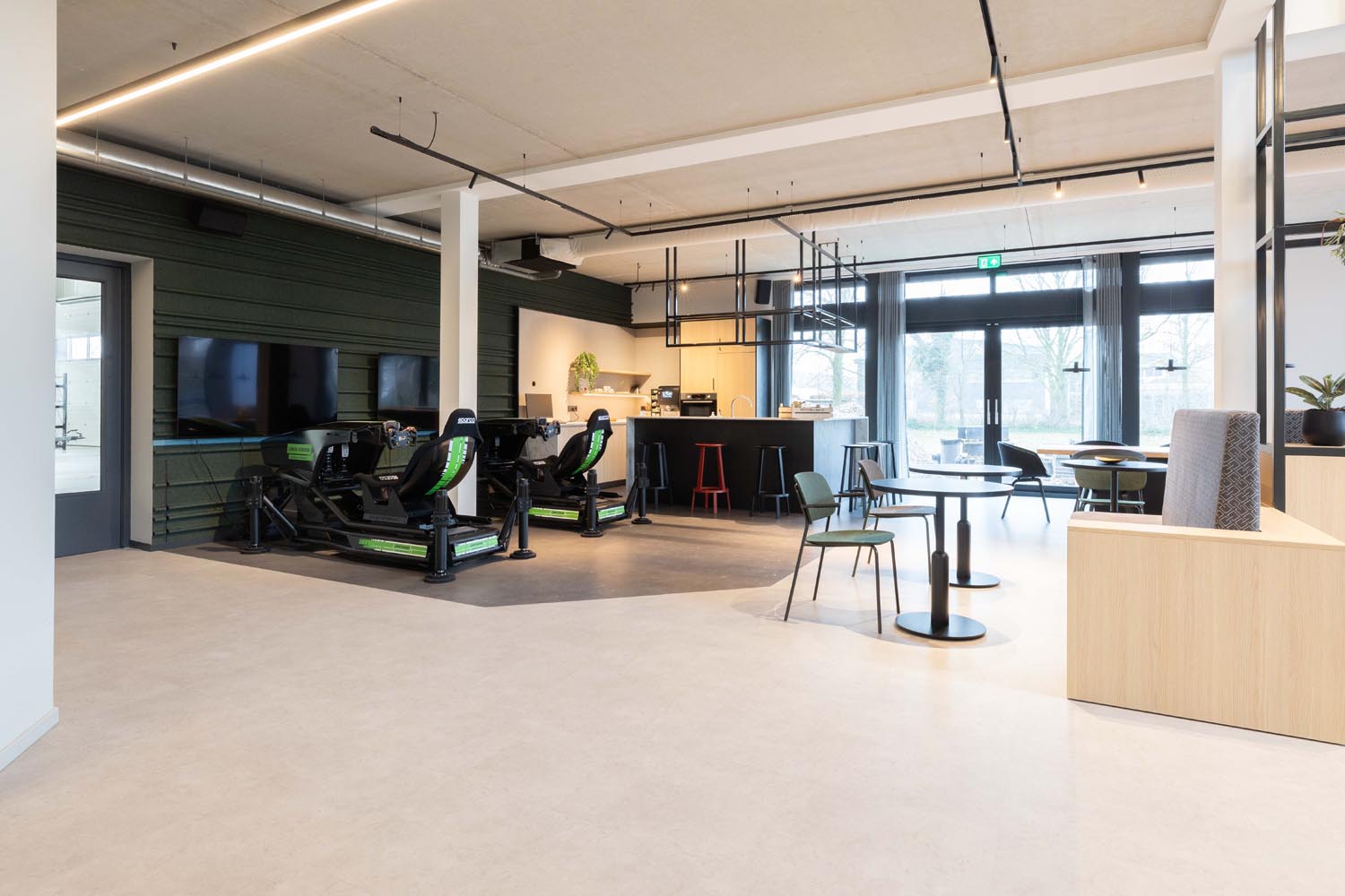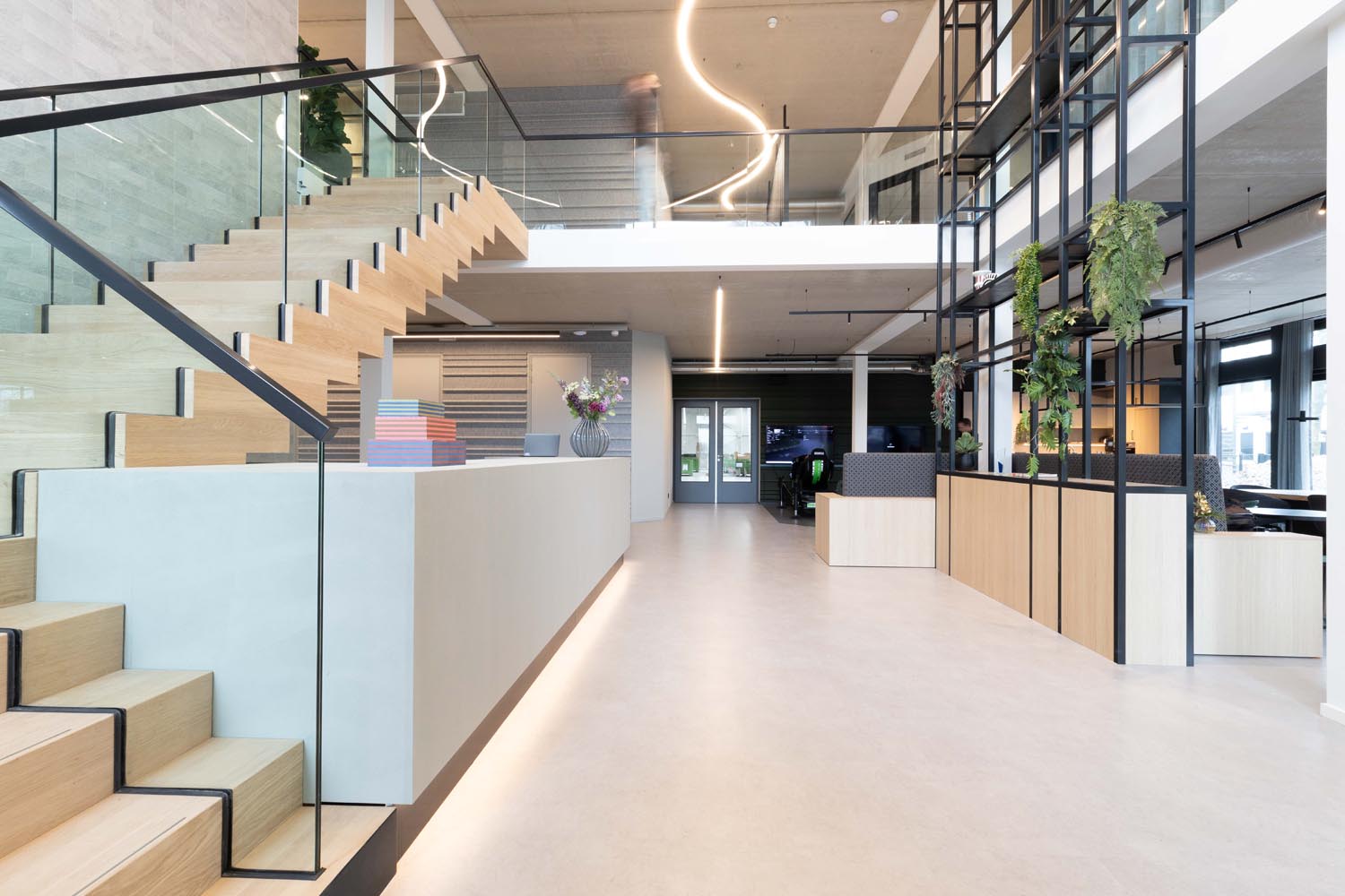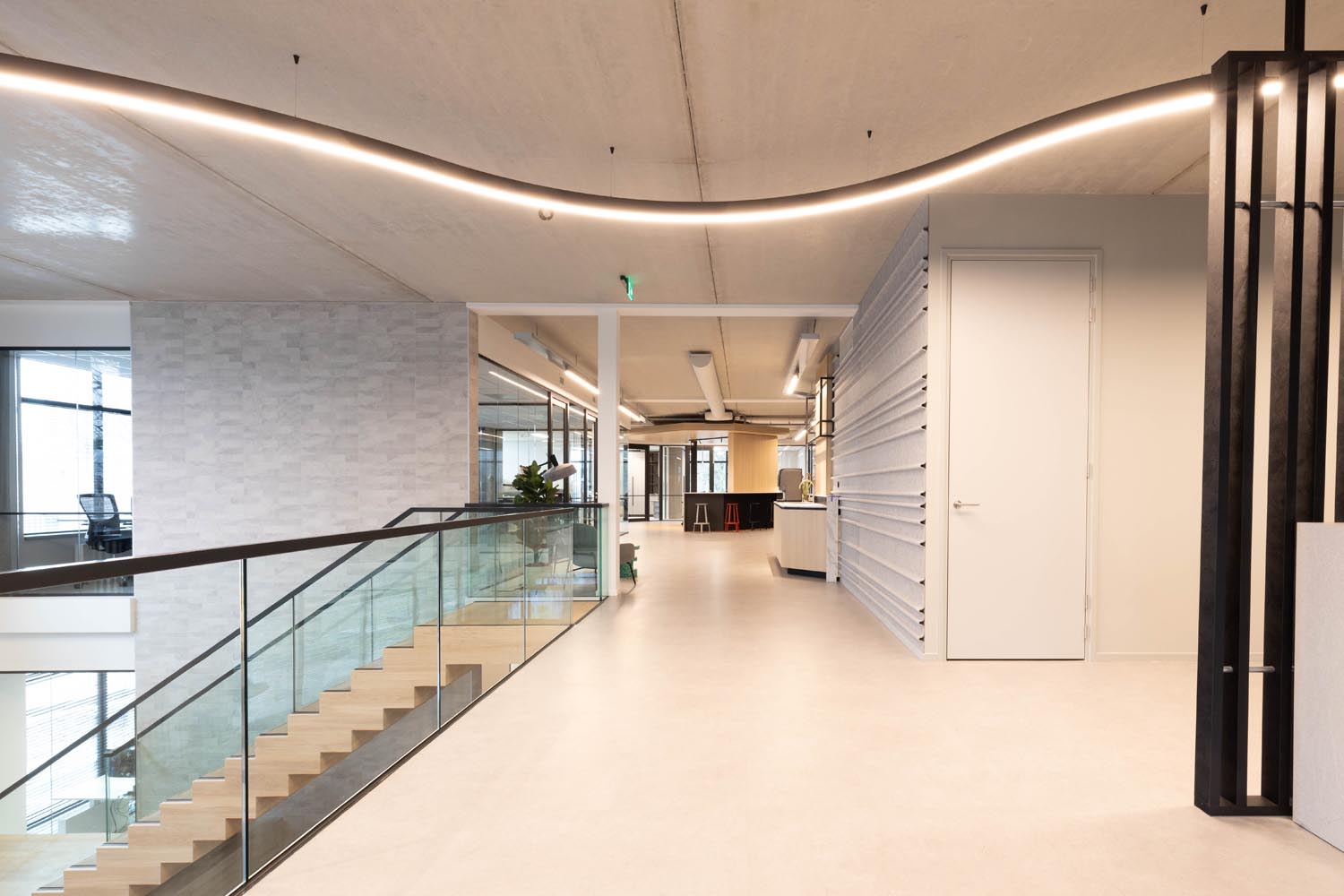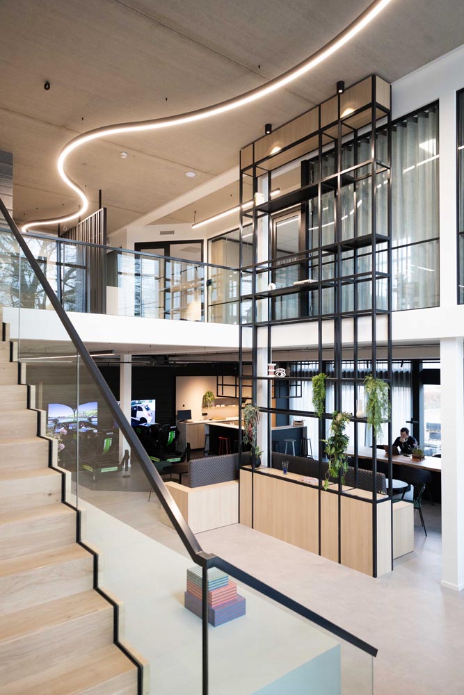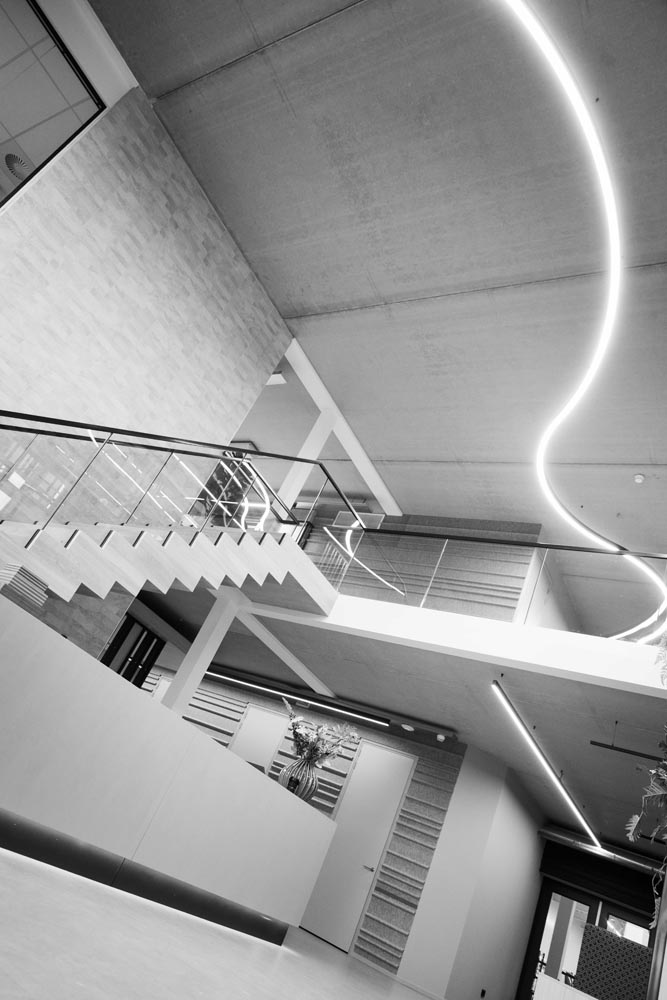 De verlichting volgt de lijn van het interieurontwerp: strak, helder en functioneel. Accenten zijn verfijnd aangebracht, en de open structuur van het gebouw blijft volledig behouden. Minimalistische armaturen brengen het licht precies waar het nodig is – niet meer, niet minder.