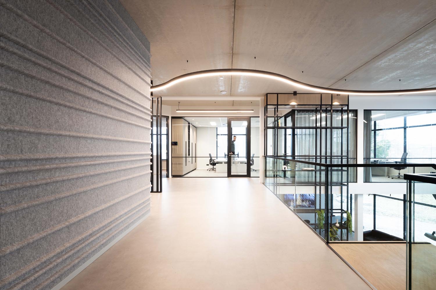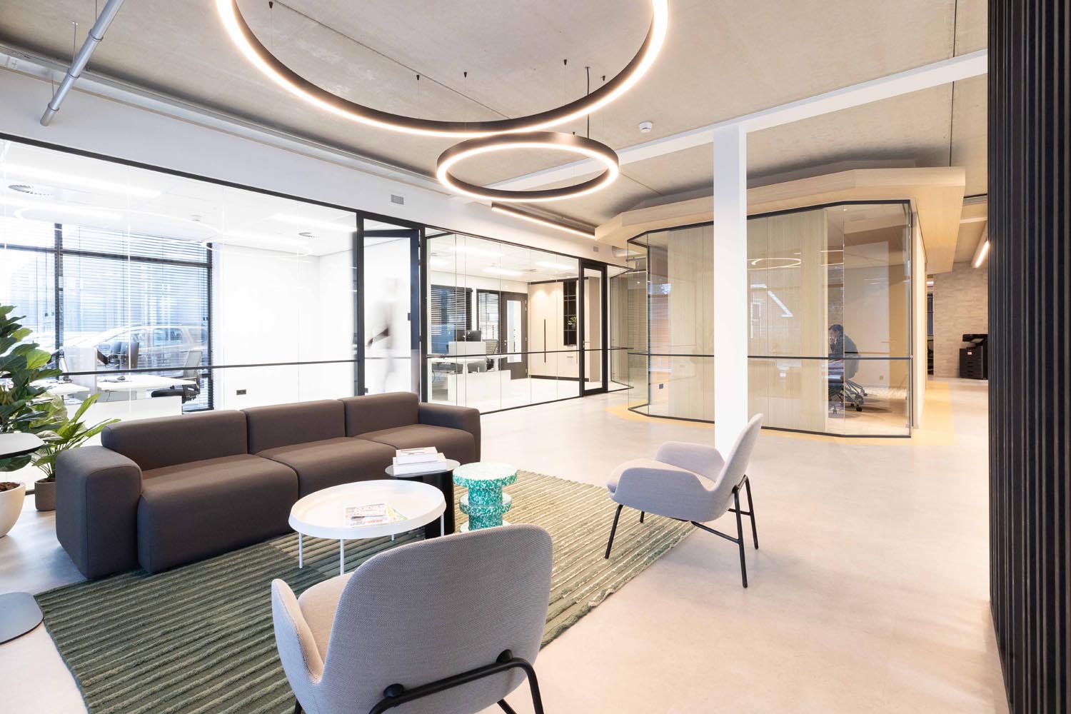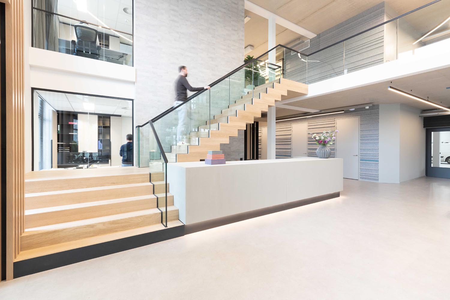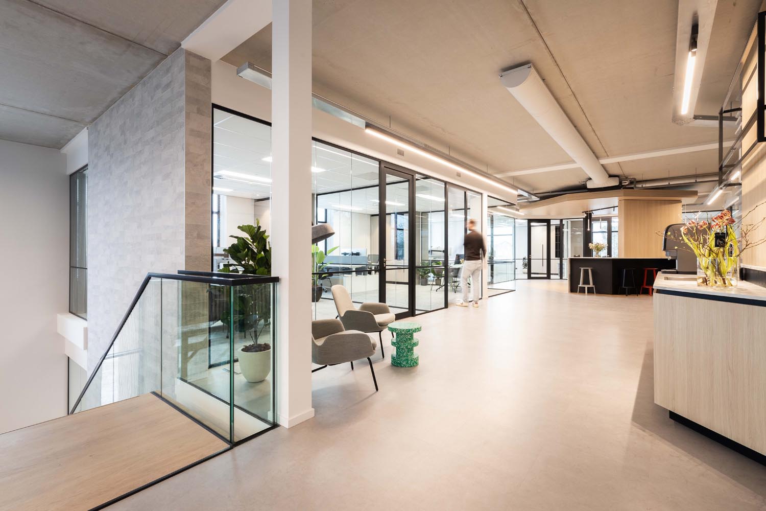 De verlichting volgt de lijn van het interieurontwerp: strak, helder en functioneel. Accenten zijn verfijnd aangebracht, en de open structuur van het gebouw blijft volledig behouden. Minimalistische armaturen brengen het licht precies waar het nodig is – niet meer, niet minder.