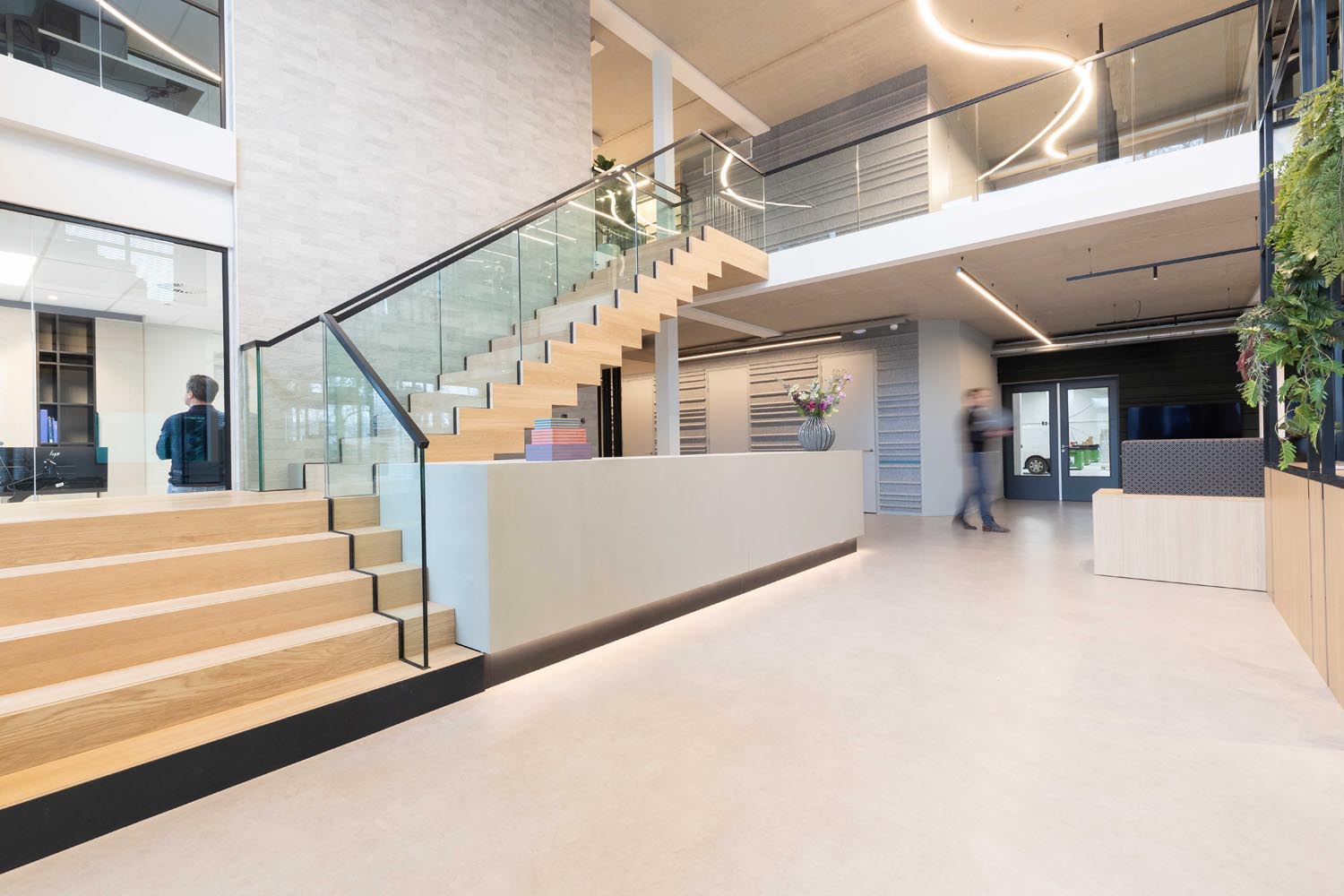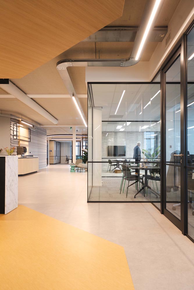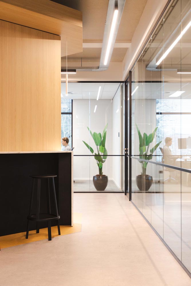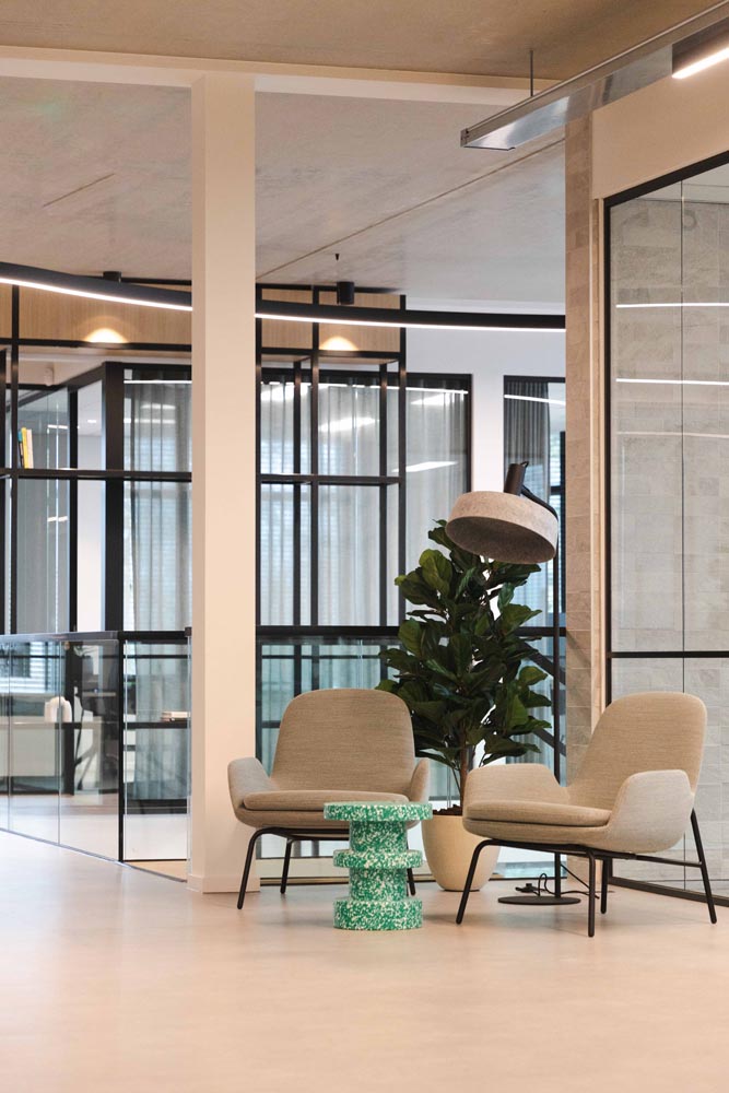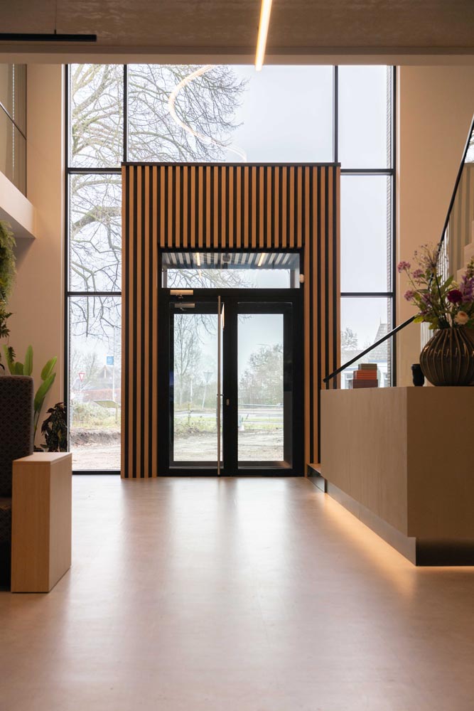 Bijzonder is de verwijzing naar het verleden: op de plek van de huidige entree bevond zich ooit sluis 6. Die historische context komt subtiel terug in een golvende lichtlijn bij de entree en druppelvormige armaturen boven de receptiebalie.