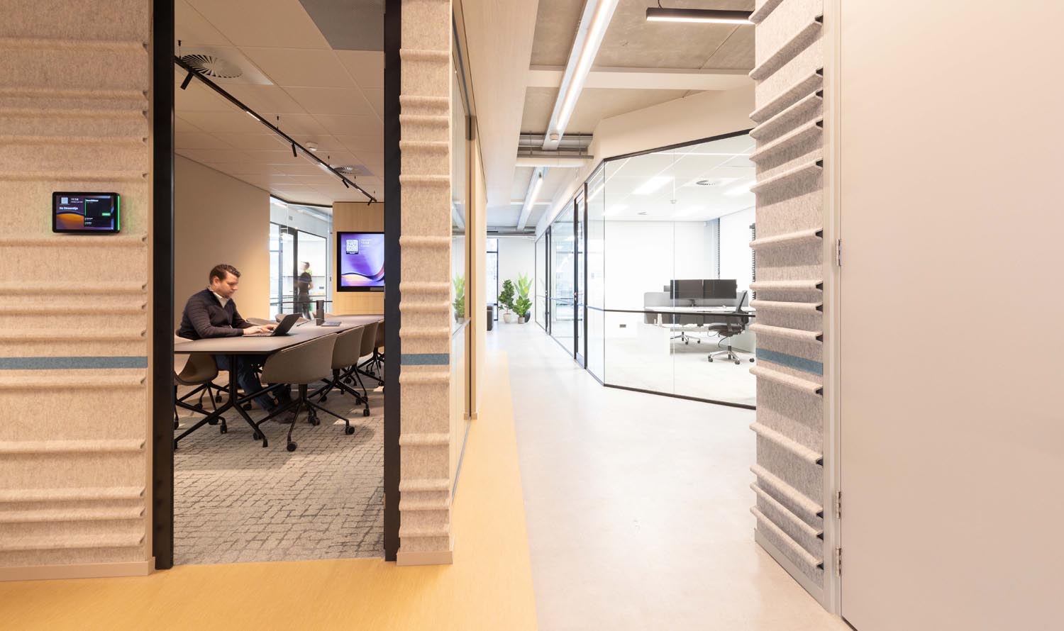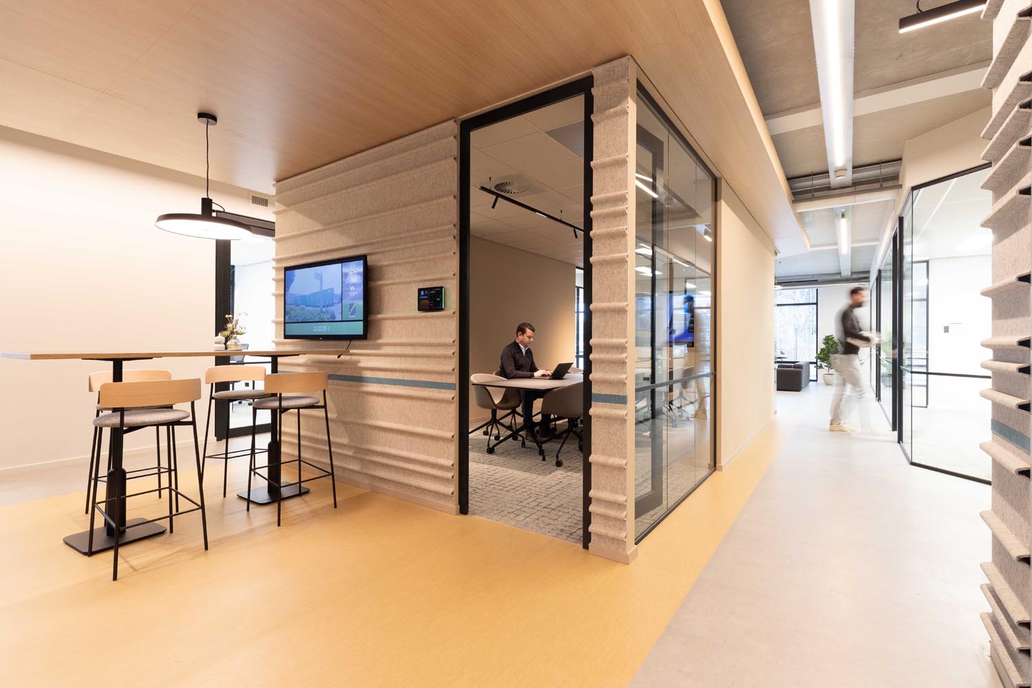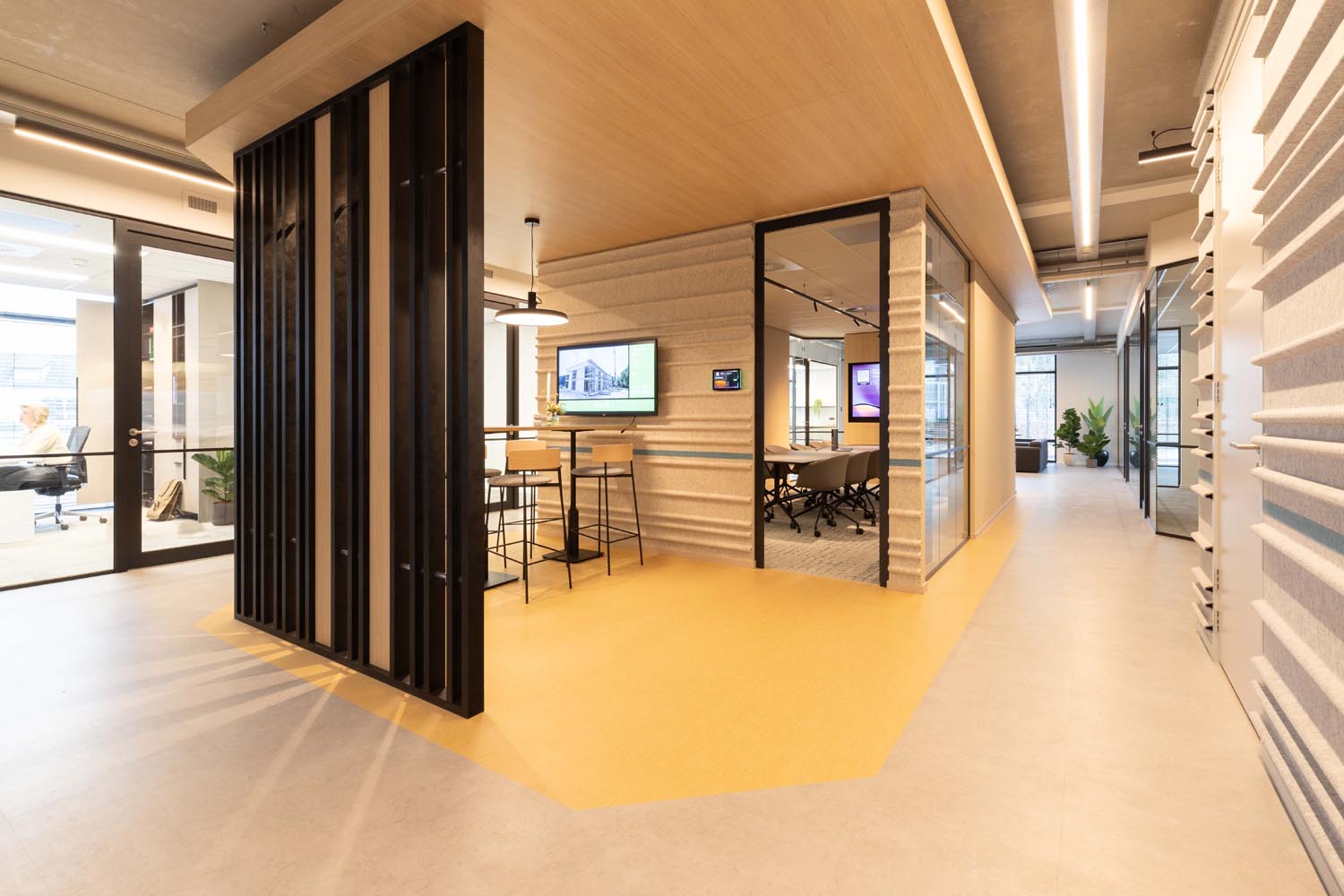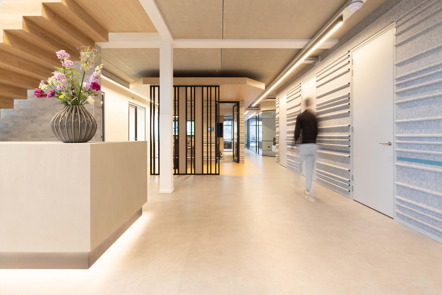 Bijzonder is de verwijzing naar het verleden: op de plek van de huidige entree bevond zich ooit sluis 6. Die historische context komt subtiel terug in een golvende lichtlijn bij de entree en druppelvormige armaturen boven de receptiebalie.